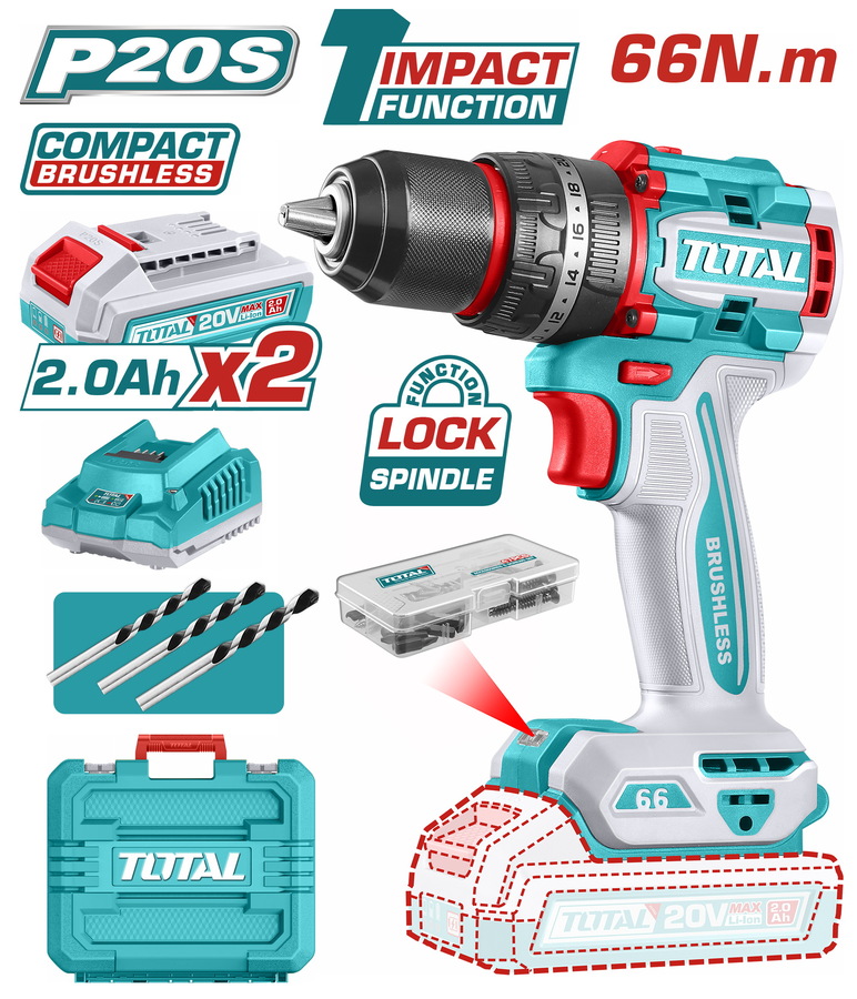TOTAL ΕΠΑΓΓ. ΔΡΑΠΑΝΟΚΑΤΣΑΒΙΔΟ ΚΡΟΥΣΤΙΚΟ ΜΠΑΤ. Li-ion 20V / 2Ah / 66Nm / 2 ΜΠΑΤ BL Motor (TIDLI20668E)